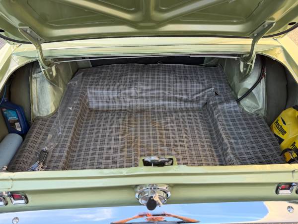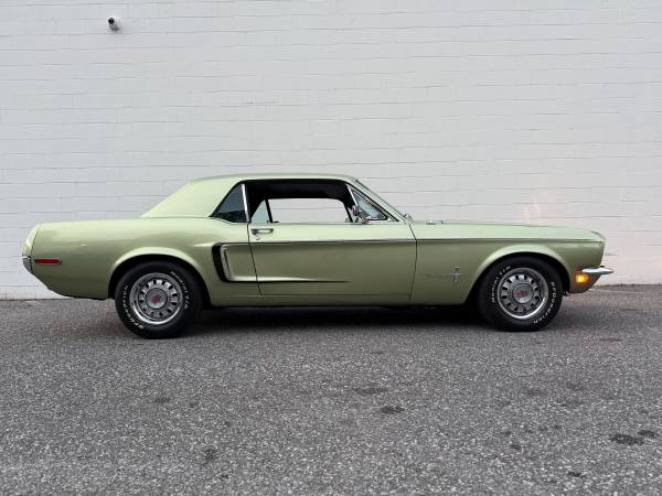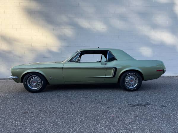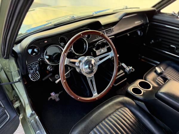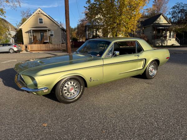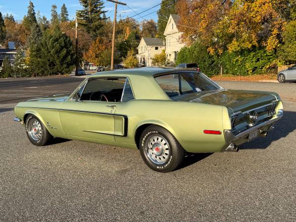 1968 Ford Mustang Sprint package B factory V8. The Sprint Package A was available for six-cylinder and V-8 models, adding C-shaped side stripes, wheel lip moldings, full wheel covers, and a pop-open gas cap. Package B was for V-8s only, utilizing the components from Package A but replacing the wheel covers with Styled Steel wheels and adding grille-mounted foglights. This particular Mustang is finished in factory light Ivy Gold with black interior. This beautiful Mustang has been resto modded with a rebuilt 351 V8 , a rebuilt, C4 transmission, and a rebuilt 8 inch end. It has been upgraded with air-conditioning and a March serpentine pulley system and high flow power steering and disc brakes. This vehicle has been upgraded with full digital gauges and turn signal indicators inside both side view mirrors along with a wood grain steering wheel. The vehicle holds a California salvage title, not due to an accident but because it was lien sold and purchased and restored by its current owner.
