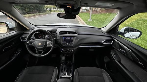 The 2022 Trailblazer LT comes dressed in a striking Summit White exterior, complemented by a sleek and contemporary design that commands attention on the road. The vehicle is enhanced by the Blackout Package, which adds an element of sophistication with dark accents that elevate its overall aesthetic.