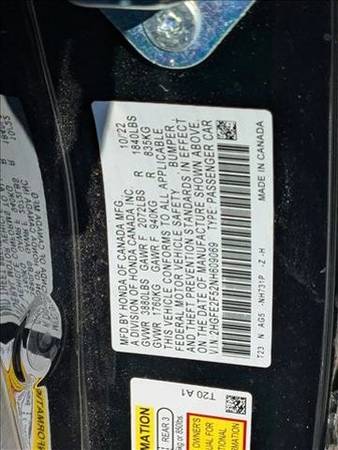 * Lane Keeping Assist * Keyless Start * Black; Cloth Seat Trim * Crystal Black PearlThis vehicle includes a Money-Back Guarantee* and passed our precise inspection process. Best of all the price you see is the price you pay. No haggling. No back and forth. No pressure. And this price is so good it is guaranteed. *Money-Back Guarantee is valid for 5 days or 250 miles, whichever comes first. Subject to certain terms and conditions. See store for details. Some restrictions apply.This outstanding example of a 2022 Honda Civic Sedan Sport is offered by AutoNation Honda Roseville. The greater your fuel-efficiency, the less your carbon footprint. And with exceptional MPGs, this Honda Civic Sedan treads ever so lightly on Mother Earth. One of the best things about this Honda Civic Sedan is that it has low, low mileage. It's ready for you to truly break it in. There are many vehicles on the market but if you are looking for a vehicle that will perform as good as it looks then this Honda Civic Sedan Sport is the one! This is the one. Just what you've been looking for.