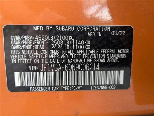 * Harman Kardon & Moonroof * Wrx Short Throw Shifter Package * Sun/Moonroof * All-Weather Floor Liners * Cargo Tray * Led Upgrade - Map & Dome Lights * Alloy Wheel Locks * Sunshade - Windshield * Keyless Start * Rear Spoiler * Carbon Black; Cloth Upholstery W/Red Stitching * Solar Orange PearlYou can find this 2022 Subaru WRX Premium and many others like it at AutoNation Subaru Roseville. This Subaru includes: SOLAR ORANGE PEARLCARBON BLACK, CLOTH UPHOLSTERY W/RED STITCHINGCloth Seats WRX SHORT THROW SHIFTER PACKAGE*Note - For third party subscriptions or services, please contact the dealer for more information.*You'll love the feel of AWD in this 2022 Subaru WRX. It provides a perfect balance of handling power and control in virtually every driving condition. In addition to being well-cared for, this Subaru WRX has very low mileage making it a rare find.Surprising quality accompanied by a high level of performance...this Solar Orange Pearl on Carbon Black Subaru WRX Premium could end up being the perfect match for you.