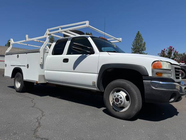 2007 GMC 3500 Dual Rear Wheel Sierra Classic Extended Cab, Utility body is 9 ft with fully lockable bins and bed, White exterior with gray interior, Power Steering & Brakes, AC blows ice cold, 10,000 - 14,000 G.V.W, 3:73 rear end ratio, 6.0L High output engine 360HP, 380lflbs of torque, Rebuilt 4L80E transmission, 161.5 wheelbase, 14 ft 10 inch overhead lumber rack, Always serviced locally at local GMC dealership.
