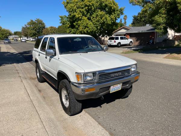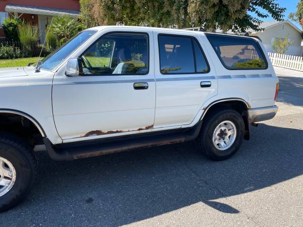 Hello everyone I am selling my 1991 Toyota 4Runner. It’s been a great truck. I had it sitting for a few years but I put a new battery and it started right up. Everything works on it including all the power switches, A\C and heater work, 4 wheel drive works. Engine and transmission are smooth. It’s a 3.0 V6. It doesn’t overheat. It’s got 248k miles on it when it sat but at 246k I had a full service done on it including timing belt/water pump and all the fluids. You can check the vin it’s all recorded with a clean title. JT3VN39W9M8031145. The body has rust spots but the undercarriage looks great. See all the photos please and read the ad before contacting me. 916 938 six eight five zero. Clean title on hand. It’s been on non operational and there’s no fees.