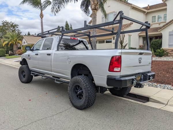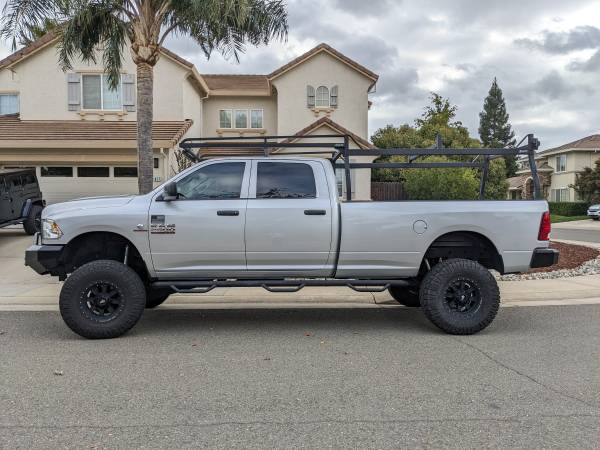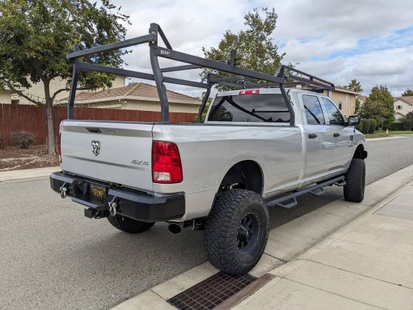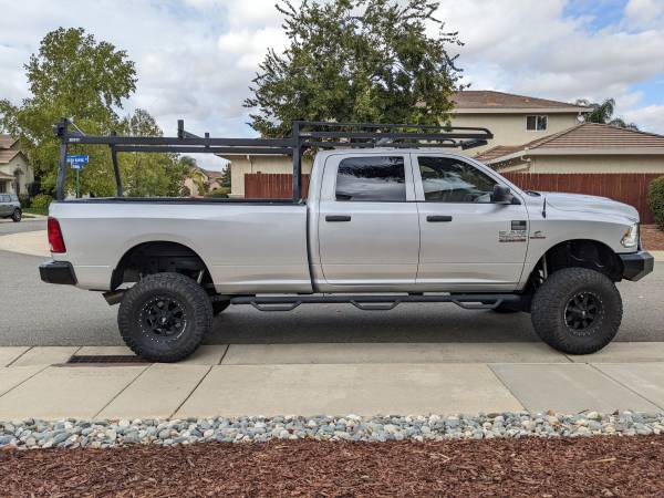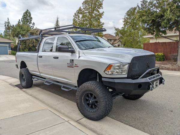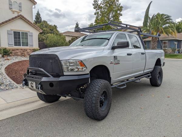 2014 Dodge RAM 2500 Tradesman crew cab, 8' bed, 6.7 Cummins diesel, 4X4, 6-speed MANUAL transmission, 63k original LOW miles, clean title in hand, current registration and smog, original California truck, original senior owner, 6" lift, Bilstein 5100 shocks, 37" Nitto Trail Grappler tires, Red Dirt Road 17" wheels, T-Rex X-Metal grill, Iron Cross front and rear bumpers, Ultra Liner spray-on bed liner, Sinister Diesel steering box support and stabilizer, FASS diesel fuel system, high-end Rack-it truck rack, engine is stock, never off road or in the snow, truck is very clean, pampered and well kept, $50k. SERIOUS INQUIRIES ONLY