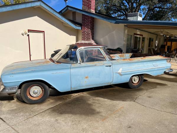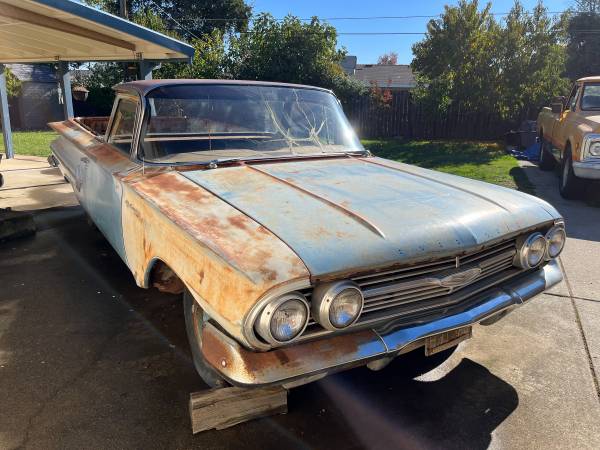 1960 Chevy El Camino, this car is complete with ALL the trim intact, all original, second owner, California car. Original first gen-1 small block 283, 2 speed pwr glide trans. DOES NOT RUN, NEED TOW TRAILER. This car was first sold in December of 1959 at John Geer Chevrolet Sac. Clean title on non-op. Great project, good candidate for all original restore. The doors, hood, and tailgate open & close perfectly, never wrecked, small dent on passenger front fender. It has been stored on pavement with a tarp over it since I rescued it. The bad news is windshield trashed, floor & bed rusted out. Major project but rare car, only about 14.000 were sold in the U.S. back in 1959-60. The body is about 85% intact, It still has the original horizon blue paint on most of the car. Too many projects so I got to let this one go. $4,500 obo, cash only, no trades, no help selling, no BS, bring trailer & cash. Thanx for looking.