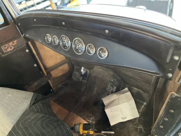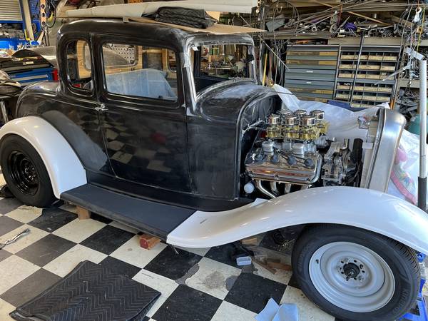 1932 Ford 5 window with California title, Rex Hutchinson blue printed 354 Chrysler Hemi, Dyno time only, 404hp@6200rpm,Isky 280 Mega-hyd cam, stainless block hugger headers, 6 Rochester carbs, Wieand polished water pump, build 350 transmission, new starter, 5 window un-chopped fiberglass body and fenders, power.windows, bear-claw latches, 6 Stewart Warner wing gauges metal dash, metal grill w/stainless insert, metal half hood, TCI powder coated frame, flaming river electric steering 40 Ford column and wheel, Corvette independent rear end, 4 wheel disc brakes with booster, new 15" steel wheels and tires, electric E-brake,Trans cooler, new 2 1/2 inch stainless mufflers and tubing, headliner kit, complete wiring kit and fuse box,Dakota digital shift indicator.