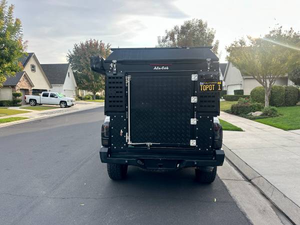 -Fully outfitted with an Alu Cab canopy camper complete with 270 degree awning, camp table, water-tank, storage panels, bug screens, mole panels, drop down table, lighting, electrical system, professional sealed install.