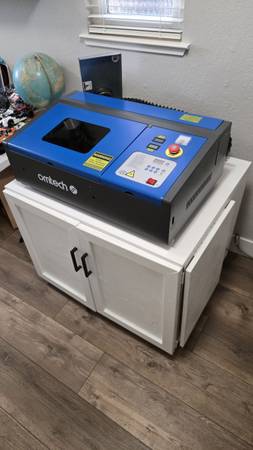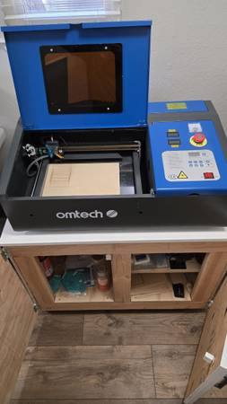 Excellent condition OmTech K40 CO2 laser with a cart and all the upgrades. It has an upgraded motherboard to run lightburn, an air assist nozzle with air pump, a water cooling system, an exhaust fan window ventilation system, and a lot of extras. $1200+ invested in this set up, but it has everything you need. $500 OBO cash, no trades. Text preferred.