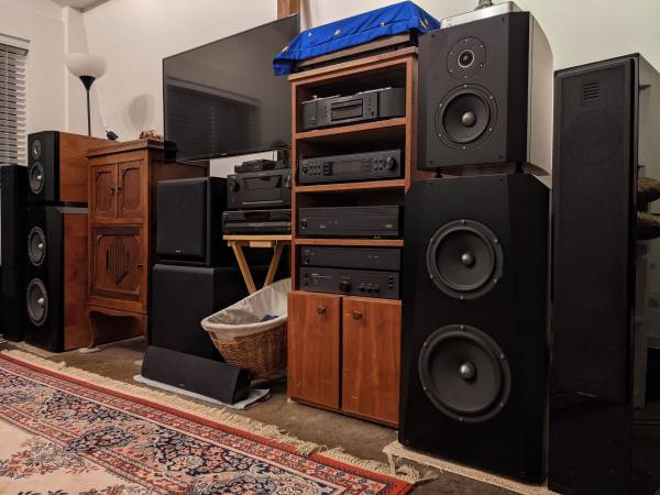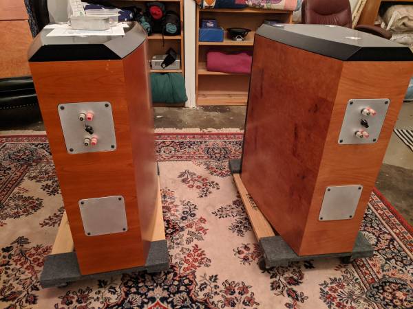 This is a pair of Pass Labs SR-1 speakers, which is a four piece set: two tops, two bottoms. None of the other equipment in the pictures is included. These speakers were restored from mint condition cabinets using all new components. I took significant effort to make these as close to the original, $20k speakers as I could, as described below. They sound amazing and have been used lightly over the 4 years since I finished them.