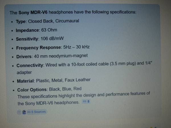 Sony MDR-V6 Studio Monitor Headphones available. Still sound excellent and ready for use. This is the earlier version made in Japan(I changed the ear cushions). Research these for more info(I've used the MDR-V900, MDR-7506, MDR-7502, MDR-V600 over the years. Plus Sennheiser, AKG, Bose, Grado, Shure, Pioneer, Denon, etc). Ideal for Studio Monitoring, Pod Cast, Field Use, or general at home music listening. You will get to audition these. Excellent noise isolation and efficient as well. Included is a gold plated 1/8" to 1/4" screw on stereo adapter. What you see, is what you get. If interested, let me know. Text/email/call me. Two7nine two2two three5six One.