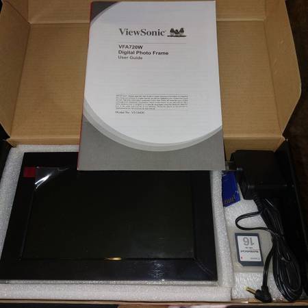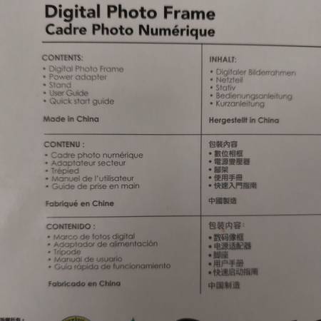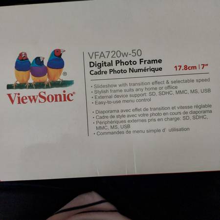 New, never used, black digital frame. Photos can be loaded and form an adjustable slide show of personal photos at a pace you choose. Instructions and memory card included.