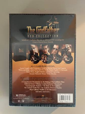 The Godfather DVD Collection New/Sealed. Includes all 3 Godfather Films plus an additional DVD containing over 3 hours of Special Bonus Materials. $15 Many more DVD’s and CD”s for sale.