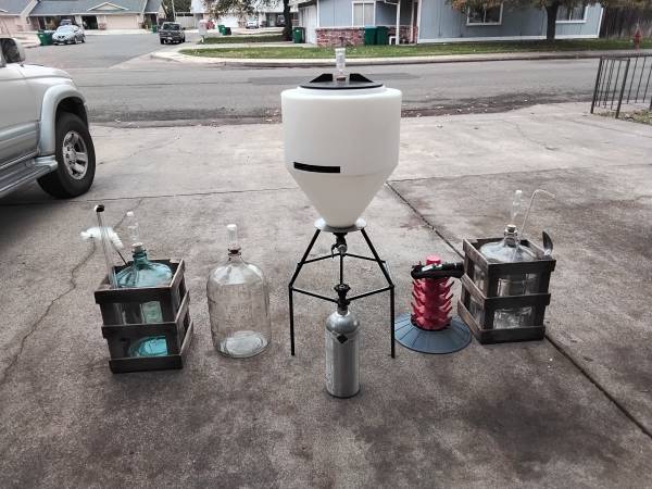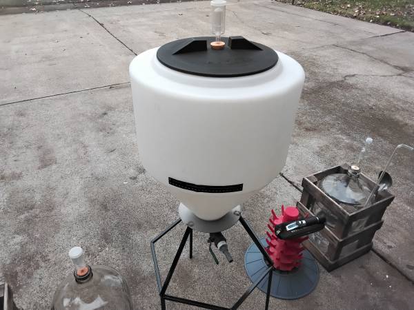 (1) 15 GALLON CONICAL FERMENTER WITH STAND AND AIRLOCK (3) 5 GALLON CARBOYS WITH AIRLOCKS (1) NEW CO2 TANK (1) REFRACTOMETER WITH CASE (1) STAINLESS STEEL BREWING SPOON (1) CARBOY BRUSH (1) CORKER...