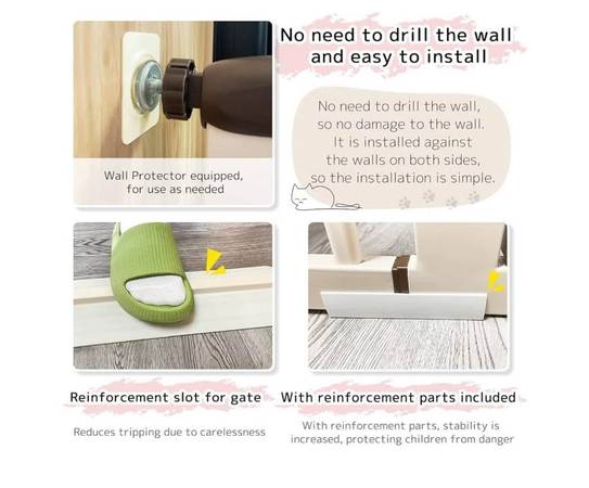 【Pressure-Mounted Design for Easy Installation】 The pressure mounted dog gate installs without the need for drilling, making it easy to set up in doorways, stairways, or hallways. You can quickly secure it in place, making it an excellent tall pet gate for homes that need flexibility without wall damage. It is also removable and expandable, adapting to different spaces when necessary.