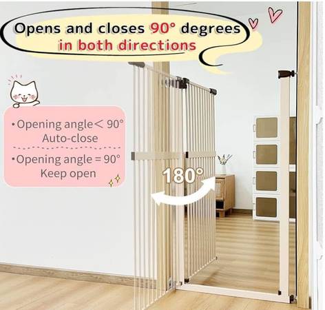 【Auto-Close Function & Adjustable Width】 The auto-close feature automatically shuts the gate if the angle is less than 90°, reducing the risk of accidentally leaving it open. When opened to a 90° angle, the gate stays open, allowing for easy access. The adjustable width makes it perfect as an extra tall dog gate or tall pet gate in various spaces. Its dual mounted option also provides added stability for larger openings or extra long spaces.
