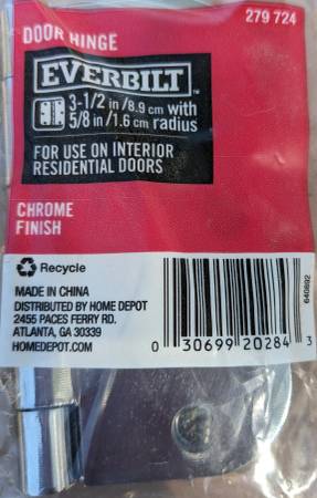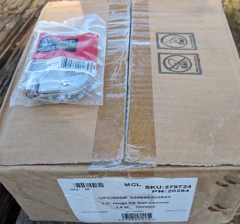 I have a bunch of 3-1/2 in. x 5/8 in. Radius Chrome Squeak-Free Door Hinges. I need to clear space for my shop, so I'm moving them along. Home Depot sells these for $3.98 + tax each, or $9.93 for a 3-pack ($3.31 each), or you can buy a 24-pack for $49.97, that works out to $2.08 each before taxes. These are brand new and unused. I'm selling them for $1.00 each (minimum of 10), or you can buy a box of 36 for $25.00. That's 69 cents each (17% of retail for a single hinge). I have multiple boxes.