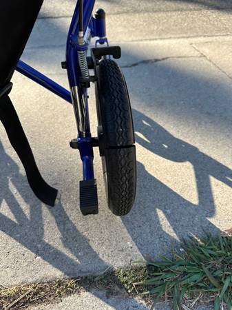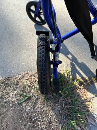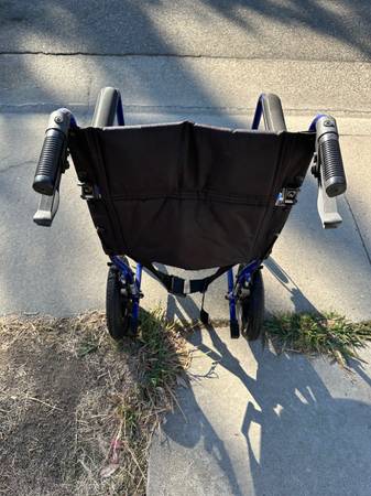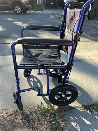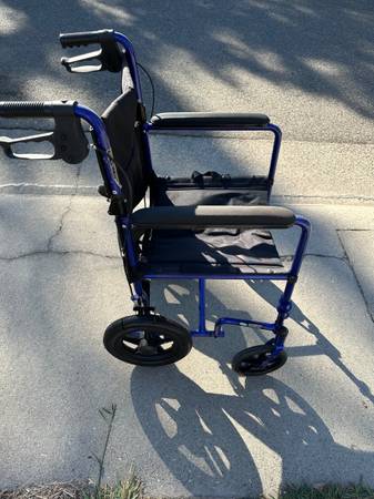 Invacare lightweight transport wheelchair. Back two wheels have a slit but work fine. Breaks are good. Has foot rest attachment as well.