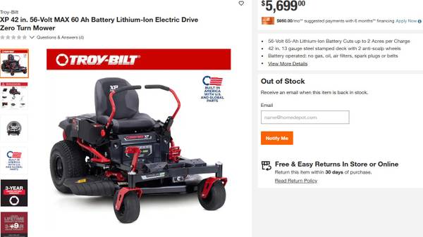Troy Bilt 42 in. Electric 56 V Battery Zero Turn Riding Mower Kit...