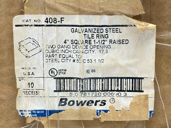 The Steel City 52C53 is a 4" square, two-gang device cover with a 1-1/2" raised profile, designed for tile wall applications. It’s made of pre-galvanized steel and provides 19 cubic inches of capacity. The cover aligns with 4" square boxes and accommodates dual devices in raised wall finishes. UL listed for reliable, code-compliant installations.