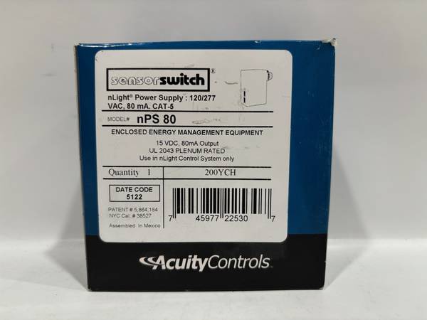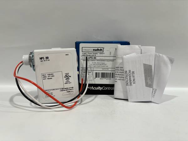 The 2-pack Acuity n-PS-80 Sensor Switch units are enclosed power supplies designed for use in energy management and lighting control systems. Each unit provides low-voltage power to connected nLight devices, supporting efficient and centralized control. These power supplies are ideal for integrating occupancy sensors, wall stations, and relay packs into a networked lighting solution.