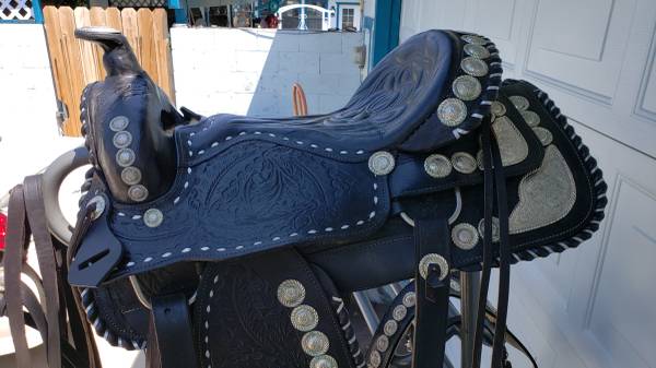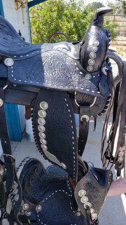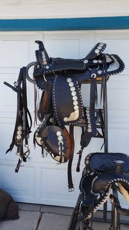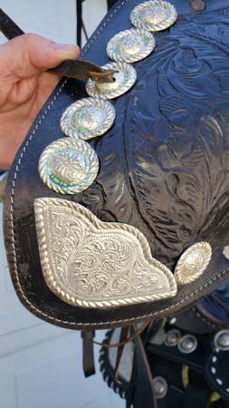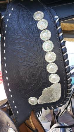 GORGEOUS SHOW/PARADE Black Saddle, Bridle, Breast Plate, TAPADEIROS, ORNATE BEAUTIFUL SILVER Trim RARE 18” seat! GREAT GIFT!! FABULOUS ORNATE NICKLE or SILVERPLATE Trim. I also have the MATCHING 15" seat show saddle! Please see last photo. GREAT condition! CASH only. OBO. No Scammers.