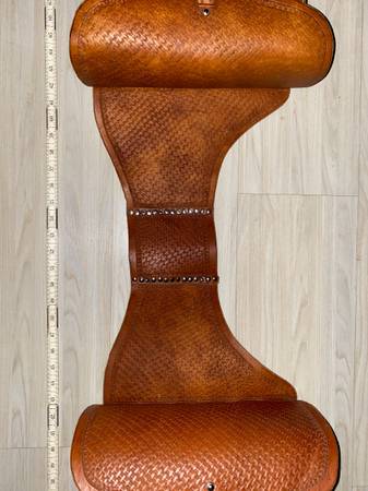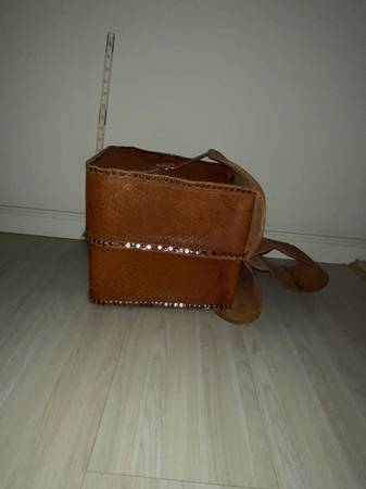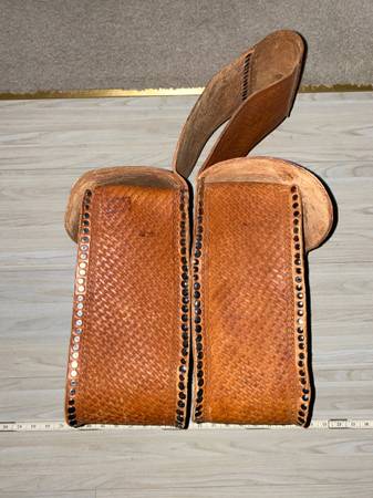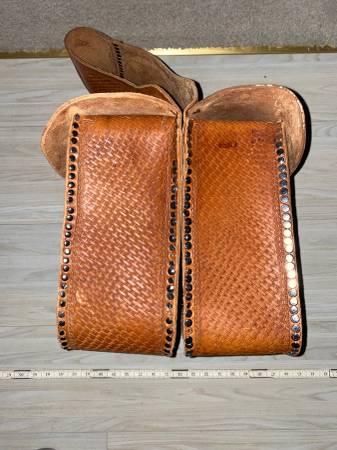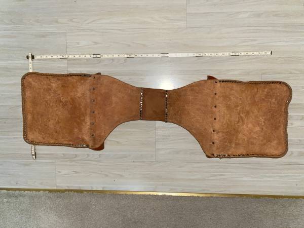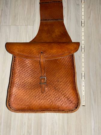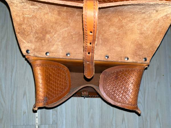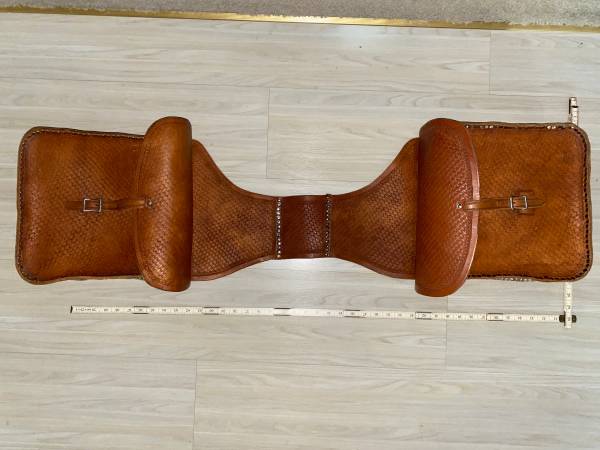 For sale is a heavy leather pair of riveted saddle bags. Very heavy tooled leather. These weigh about 7 pounds. Good shape. Probably could be used with a motorcycle or a bicycle. The pictures portray the best description along with the dimensions.