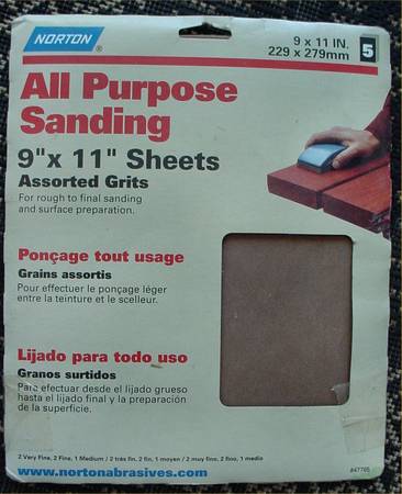 5" 5 Hole Disc Sandpaper Random Orbit Hook and Loop Sanders 20 - 2 each of (60/80/120/180/220) - $5 Norton Assorted 9 x 11 Sandpaper, 2 very fine, 2 fine, 1 medium - $4 Norton Sanding Belt - 1 x 30...
