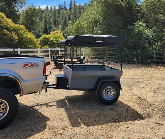 Overland Tent trailer, Brand new Custom built.8.5 gallon pressurized water tank ,solar heated with hand held shower nozzle. Tent sleeping area is 94" x 56" large enough for 2) adults and child. Cargo area 4' wide x 5' long x 20" deep, plenty of room for cooler, chairs, stove and all your camping gear for roughing it. Trailer has built in stabilizers. Utility box w/ 12v battery for charging phones , the LED light in tent and small compressor for water tank. Connections for recharging battery .