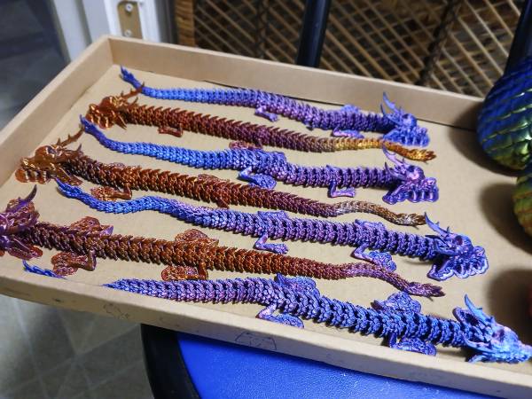 DRAGON EGGS 3D printed in iridescent or striped rainbow filament. DRAGONS / lizards are articulated. 9.25" long EGGS screw open / closed. they have a flat base. 3.25" hi great for easter basket...