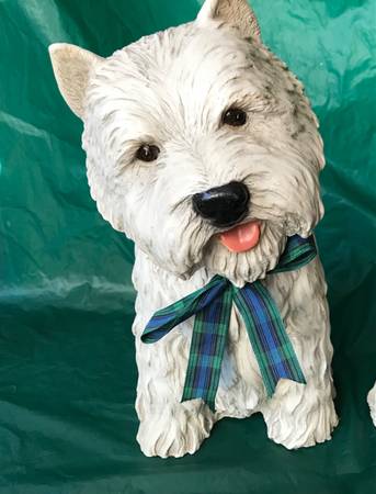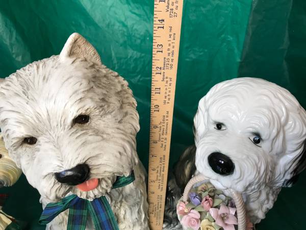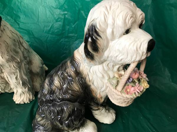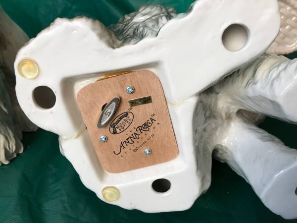 The dog will a flower basket is a music box by Anna Rosa San Francisco Music Box Company. It’s a porcelain statue. It’s in perfect condition without any chip or crack.