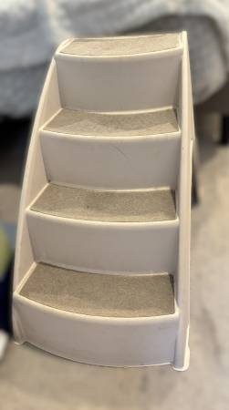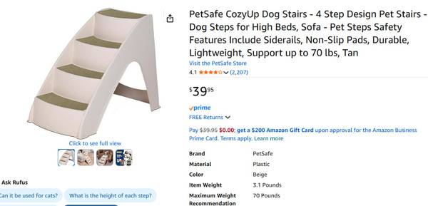 PetSafe CozyUp Dog Stairs - 4 Step Design Pet Stairs - Dog Steps for High Beds, Sofa - Pet Steps Safety Features Include Side Rails, Non-Slip Pads, Durable, Lightweight, Supports up to 70 lbs, Tan. 24" x 16" x 20". Retails for $40.