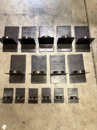 Heavy Solid Steel Candle Holders with glass. Brand new 9 at 6”x 11” 6 at 4”x 6” Paid over $300 all for $80