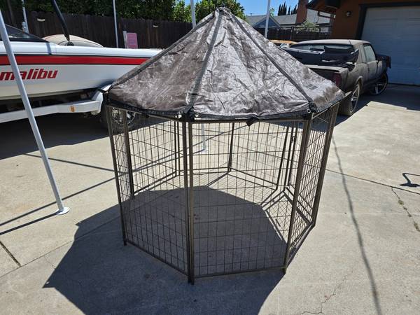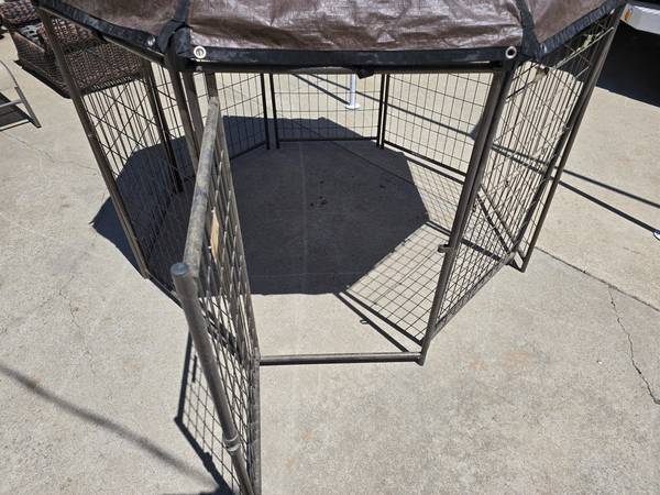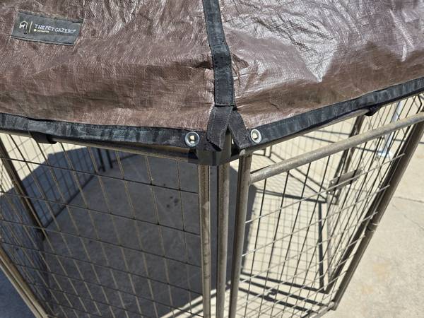 Pet Gazebo 8 Panel Indoor And Outdoor Metal Dog Playpen Kennel 5FT for $110. It normal wear. The pictures don't show the bottom connectors, but they're included. Missing 8 standard ball bungee cords for the top cover. Each panel measures about 24"x 41"H and the whole kennel 60" in diameter.
