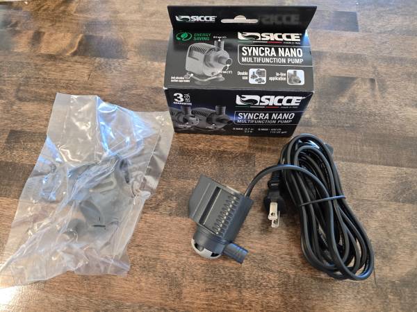 Sicce Syncra Nano Compact Aquarium Pump 110 GPH for $20/firm. I used it for a couple of minutes. I knew it was a little too small for my 3ft fountain, but I gave it a try.