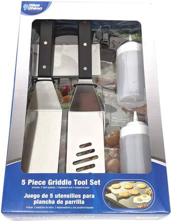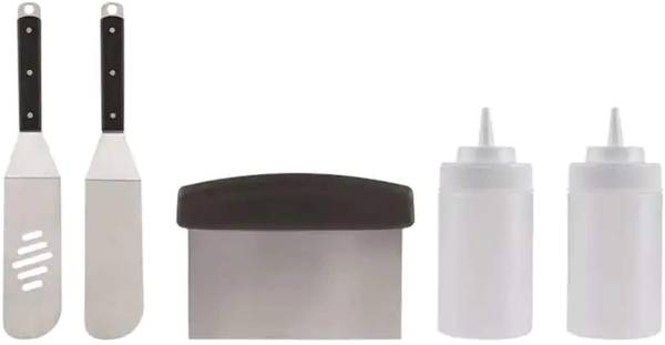 The Blue Rhino Razor 5 piece griddle tool set is a must-have for every outdoor chef so you can move, flip, clean and care for your griddle like the pros do. The stainless steel spatulas each have a long surface with rounded corners to help flip food easily. The steel scraper scoops and chops food both on and off the griddle, in addition to cleaning the griddle surface. Two clear dispensers are included to hold anything from oil to season your griddle, water to marinate or clean the surface, or just hold your favorite condiments and marinades.