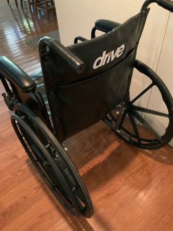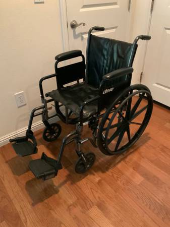 This is a quality Drive wheelchair in like new condition. The seat measures 18 inches across, the standard for an average size adult. It has foot rest as well as heel supports for maximum comfort. The arms can move out of the way for easy transfer as well. Lastly, the wheelchair collapses compactly for travel or storage.