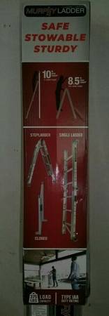 The MURPHY LADDER goes where no other ladder can go with its safe, sturdy and stowable design. The MURPHY LADDER features pinch free design, fully compactable for storage, non-marring feet, and easy maneuverability. Easy to use compactable design is optimal for maximizing storage space or transporting on the go. Stepladder position has a total height of 4.5 ft. with a 9.5 ft. reach. Single ladder position has a total height of 9 ft. with a 12 ft. reach. Reach is based on 5 ft. 6 in. person with 12 in. reach. Type IAA duty rating and load capacity of 375 lbs.