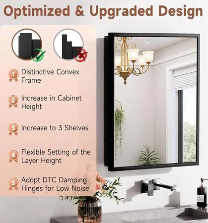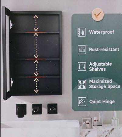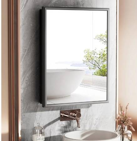 NEW IN BOX RUST-PROOF BLACK ALLUMINUM MEDICINE CABINET CAN BE INSTALLED FLUSH-MOUNT OR RECESSED FOR STORAGE AND HIGH-DEF MIRROR. INSTALL OVER SINK OR AS SECONDARY FOR MULTIPLE ANGLED DRESSING MORROR...