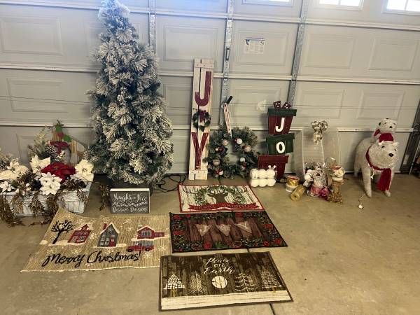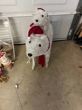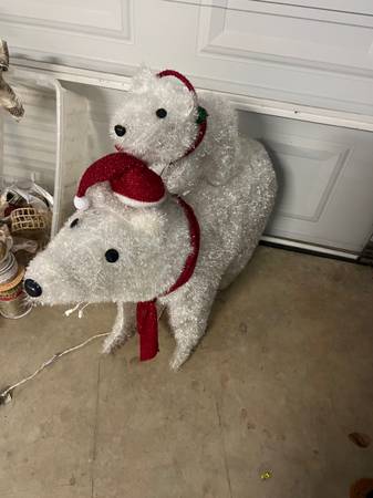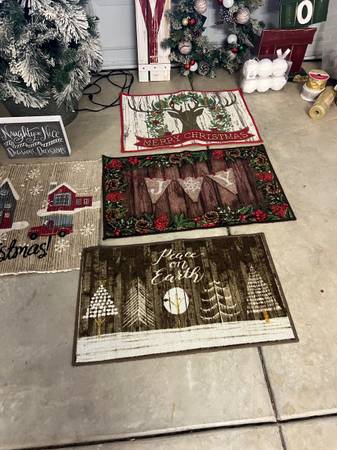 Many Christmas items for sale. Refer to pictures. Starting at $5. Christmas tree w/ lights $45 Polar bears w/lights $35 Poinsettia planter box $20 Rugs and carpets $3-$5 Wreath $10 4 reindeer,...
