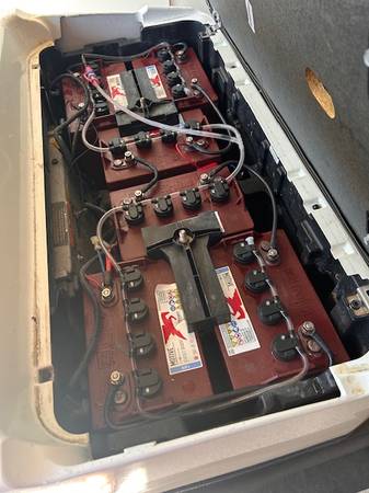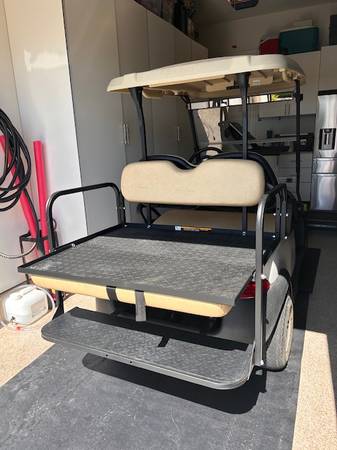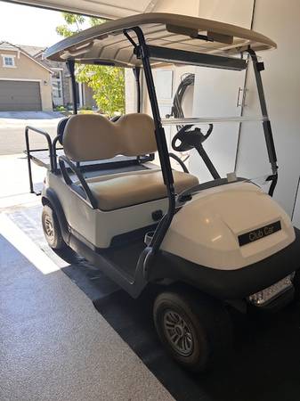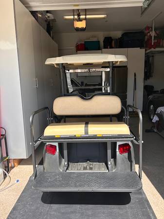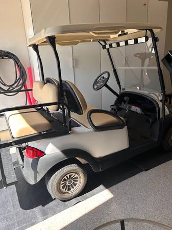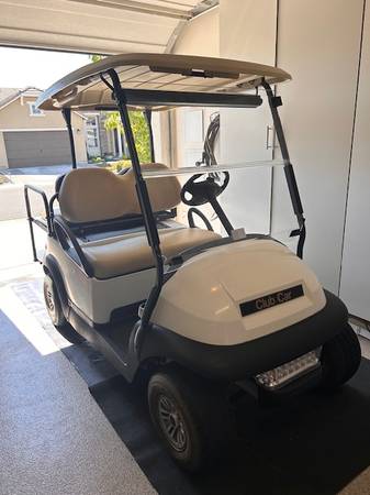 Club Car, 4-seats with drop down in back for hauling. White with tan leather seats. New batteries installed 18 mos ago. Comes with charger and water system. Rarely used but kept well maintained with a routine maintenance service this past January. You must be able to pick up. Purchased from Gilchrist.