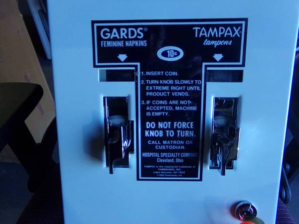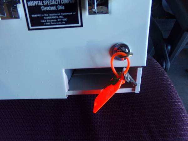 Brand New Single Coin, White, Wall mounted Sanitary Napkin and Tampon Dispenser. Brand -Hospital Specialty Company. This comes with keys. Price $100 OBO. Our ref: Rolling stair Cart. If interested, please call me or text is fine.