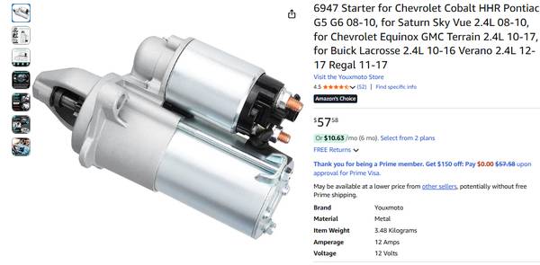 6947 Starter for Chevrolet Cobalt HHR Pontiac G5 G6 08-10, for Saturn Sky Vue 2.4L 08-10, for Chevrolet Equinox GMC Terrain 2.4L 10-17, for Buick Lacrosse 2.4L 10-16 Verano 2.4L 12-17 Regal 11-17