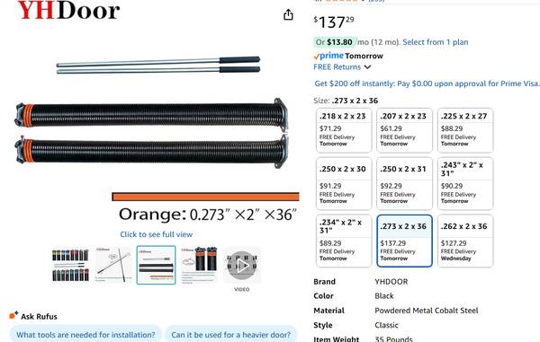 SPECIFICATION: The spring size is 0.273"X2"x36", it is suitable for 7' or 8' high door with standard lift.
