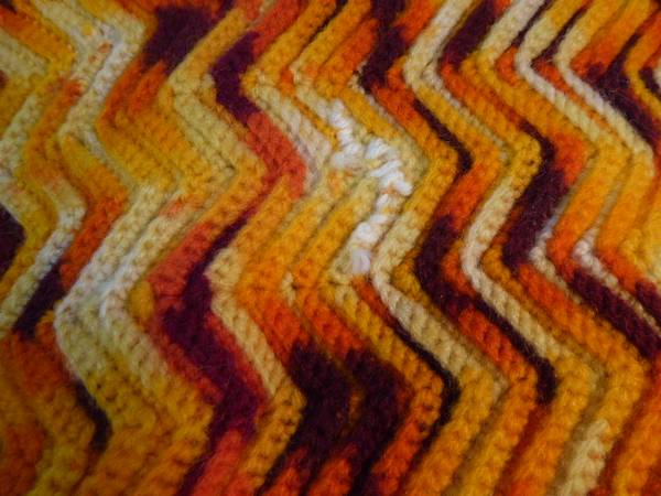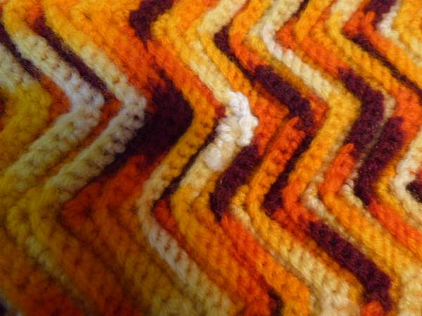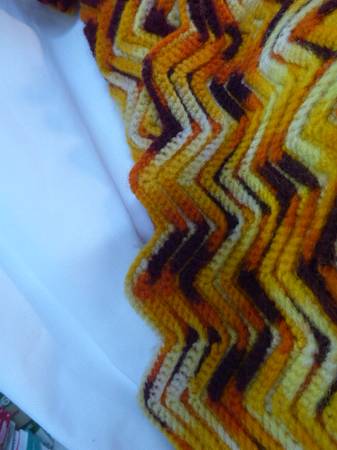 This is a Vintage Orange/Brown/Yellow Knitted Afghan in the zigzag chevron pattern. Measures 6 feet x 58 inches. 6 small repairs with white yarn. No stains. No smells. $20. It is in Penryn. Call to...