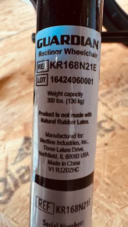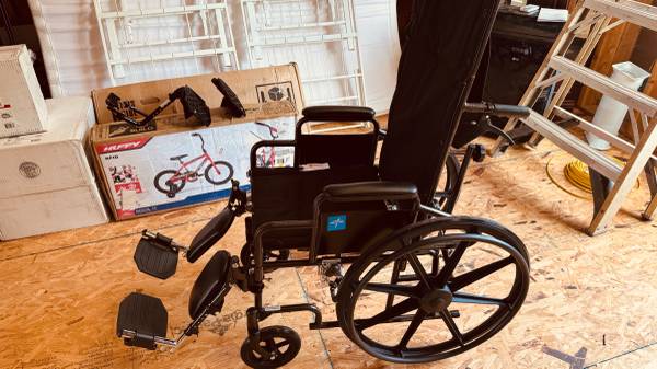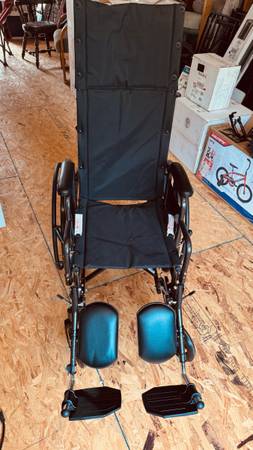 Medline Reclining wheelchair with 18 inch seat. Supports up to 300 lbs. Reclining from 90 degrees to 140 degrees. Comes with anti tippers, 22 inch high back and 10 inch removable headrest. Please see model number in photos for more information. Never used.