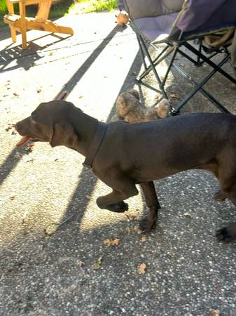 This little girl is classic GSP: sleek athletic build, big floppy ears, and that non-stop wagging tail. Super playful, insanely curious, and bursting with puppy energy. Loves zoomies in the yard, chasing balls, playing tug, and then crashing hard for cuddles on the couch. Already a total clown who will keep you laughing all day