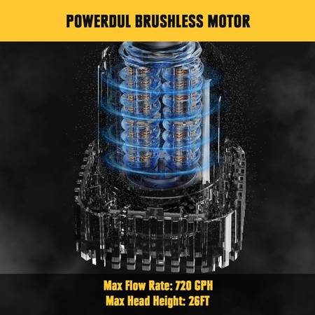 Up to 720 GPH Flow Rate: Equipped with powerful brushless motor, the electric water pump can handle a staggering flow rate of up to 720 Gal per hour. Say goodbye to slow and inefficient water pumping! Max head height: 26 FT, Max flow: 720 GPH