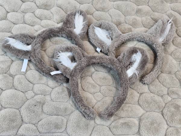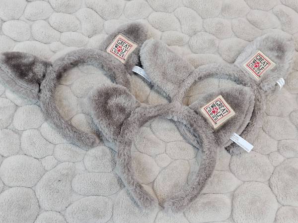 Great Wolf Lodge headbands! These adorable headbands are a souvenir from the Great Wolf Lodge water park. Taupe colored fur with white fur inside the front of the ears. There is a label on the back of one ear with the "Great Wolf Lodge" logo. Great way to announce an upcoming visit to the water park...or use them for your next cosplay costume!