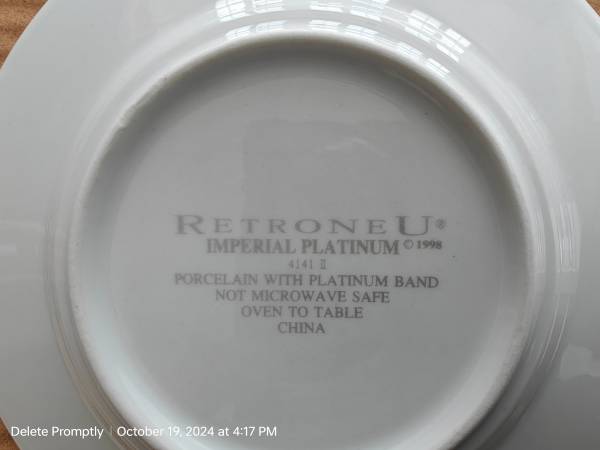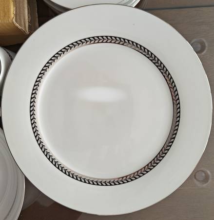 Brand new elegant 44 pieces Retroneu Imperial Platinum dinnerware set for serving 8 persons. The set includes 1 serving plate, 1 serving bowl, 8 dinner plates, 8 Salad Plates, 8 bowls, 8 cups, 8 saucers, Cream and sugar bowl in original Packaging $160 or b/o.