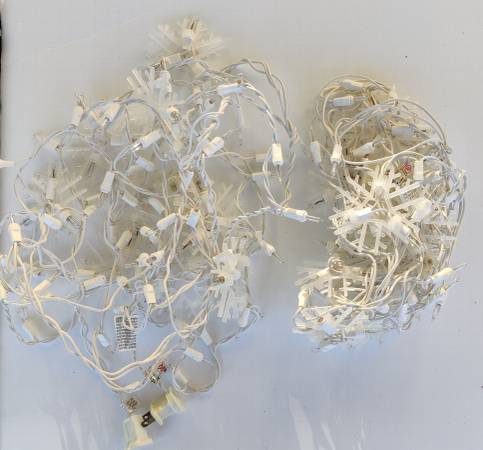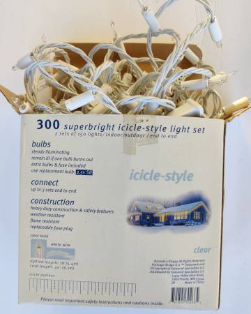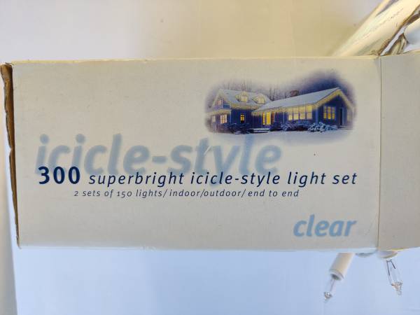 2 sets of clear straight icicle style bulbs perfect for decoration around indoor stair rails, or outdoor around the eves about the house, above garage, etc. Each is about 45 feet. This set is brand new and only opened to be tested. Each set $18.