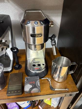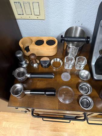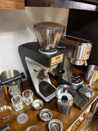 Come with everything in pictures that’s baratza sette 30 coffee grinder, De'Longhi Dedica Maestro Plus coffee machine, a regular portafilter, a bottomless portafilter, double single and cleaning portafilter inserts, spring tamper, regular tamper, grinder attachments for direct grind into the portafilter or into a container, also grind container, wooden tamper and portafilter organizer, espresso screen, scale, puck coffee waste knock box, and two espresso cups. Everything works flawlessly had it for a little over a year only selling because I upgraded so no need of this and it comes with absolutely all you need.